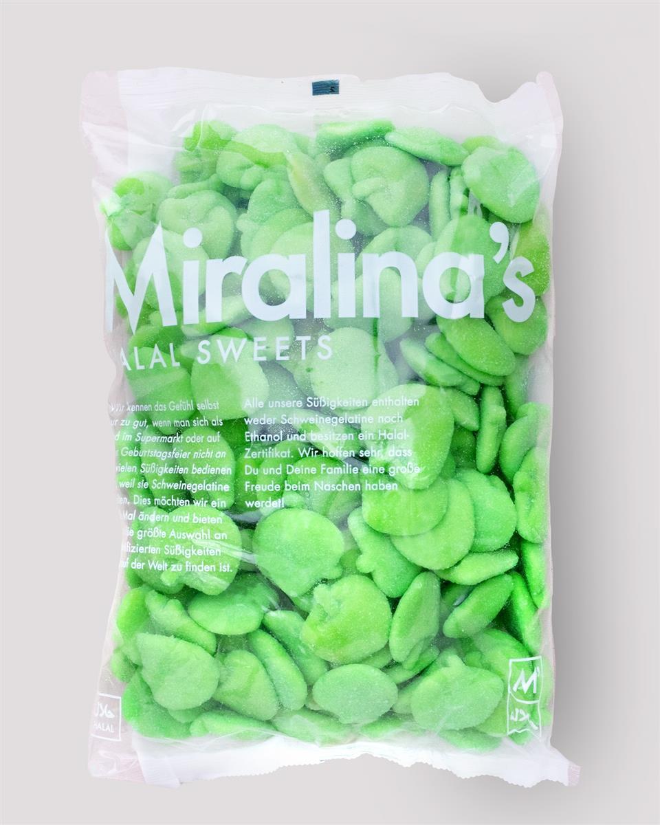 Dies sind die leckeren Schaumzucker Äpfel von Miralina's Halal Sweets . In dem Beutel sind 500g halal Süßigkeiten enthalten.