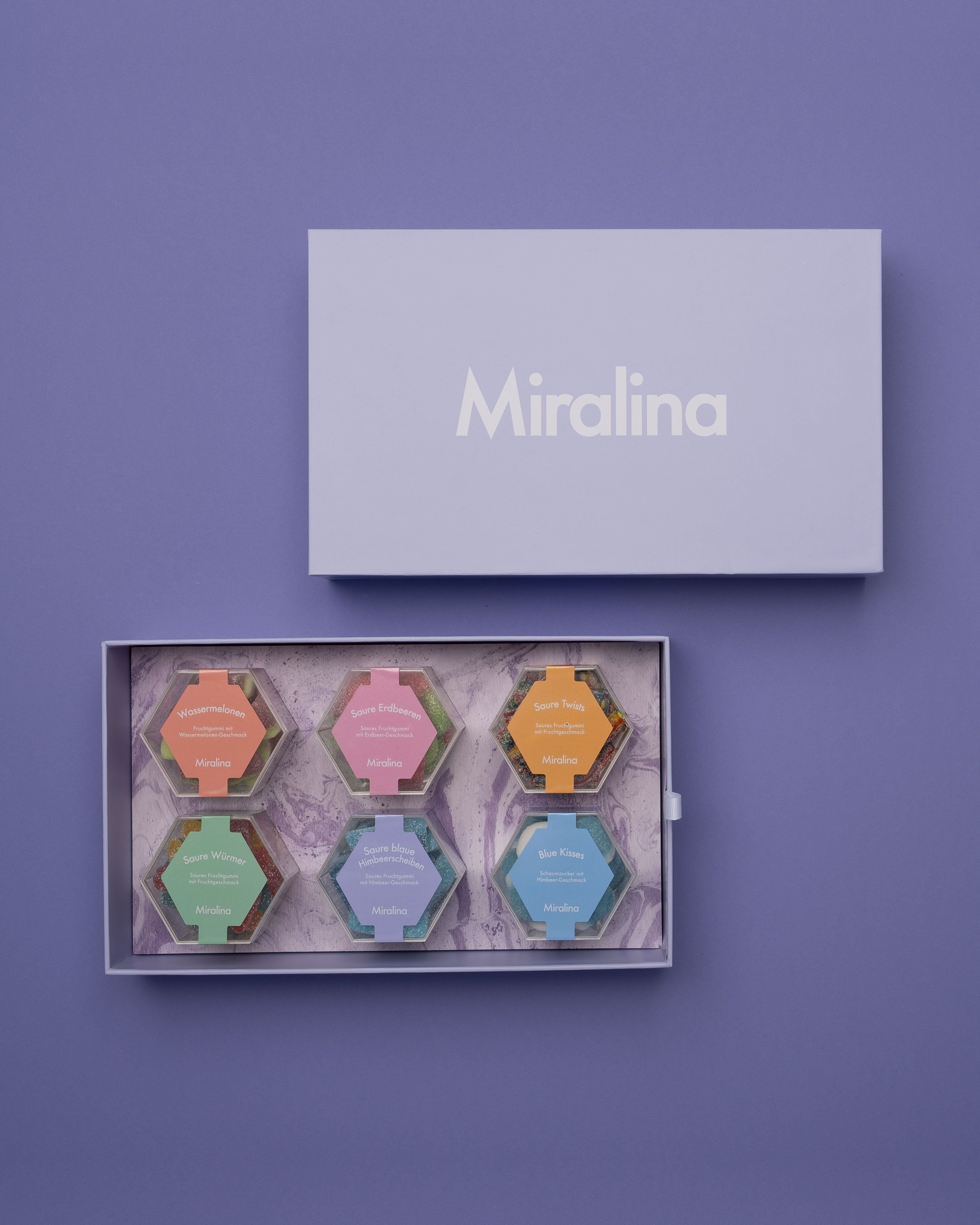 Du bist auf der Suche nach einem hochwertigen Geschenk? Hier findest Du sechs Geschmacksabenteuer in einer eleganten, lavendelfarbenen Süßigkeiten-Box: Die Miralina Geschenkbox vereint unsere beliebten Fruchtgummis in einer hochwertig-verarbeiteten Verpackung. Das marmorierte Inlay und das minimalistische Design machen die Box zum perfekten Geschenk – zum Teilen, Probieren und Genießen.